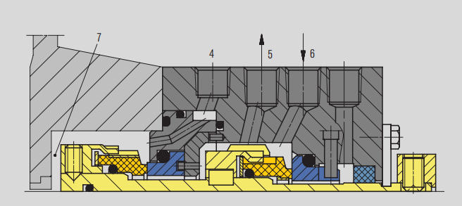 1. Din zona de înaltă presiune a pompei (descărcarea pompei sau conducta de refulare a pompei) 3. Port de spălare (F) 4. Răcitor (Q) 5. Port de scurgere (D) 6.Cameră de etanșare