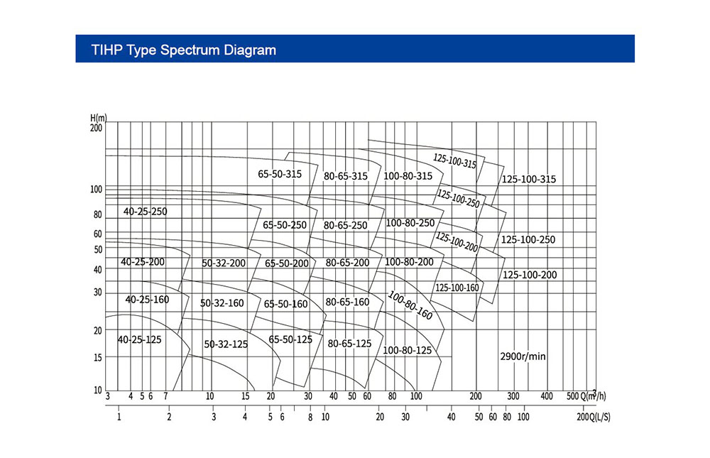 Notația „2900 r/min” din colțul din dreapta jos denotă viteza nominală a pompelor din acest spectru (viteza standard pentru pompele conduse de motor). Pentru viteze diferite (de exemplu, 1450 r/min), utilizați Legea similarității pentru a converti performanța: